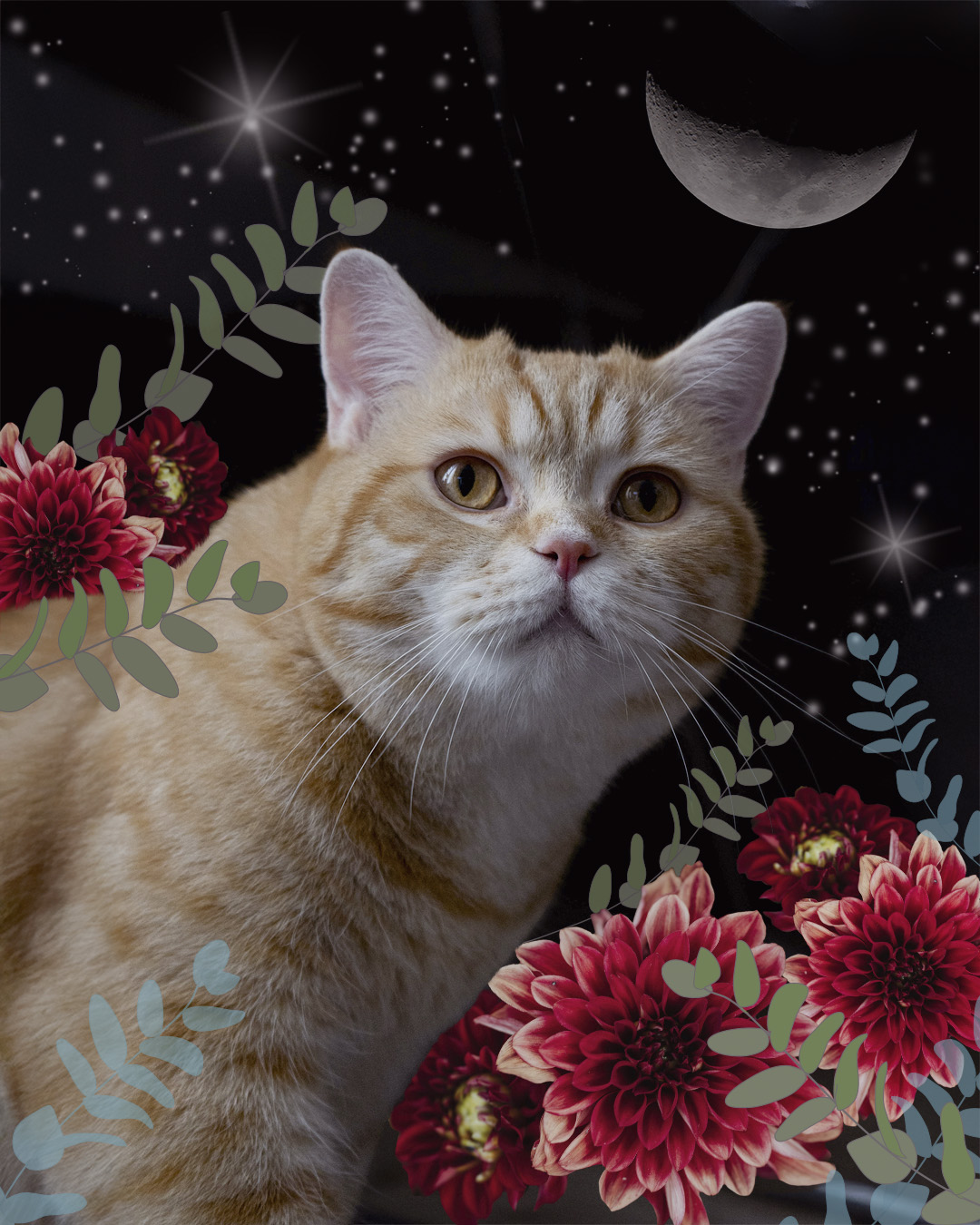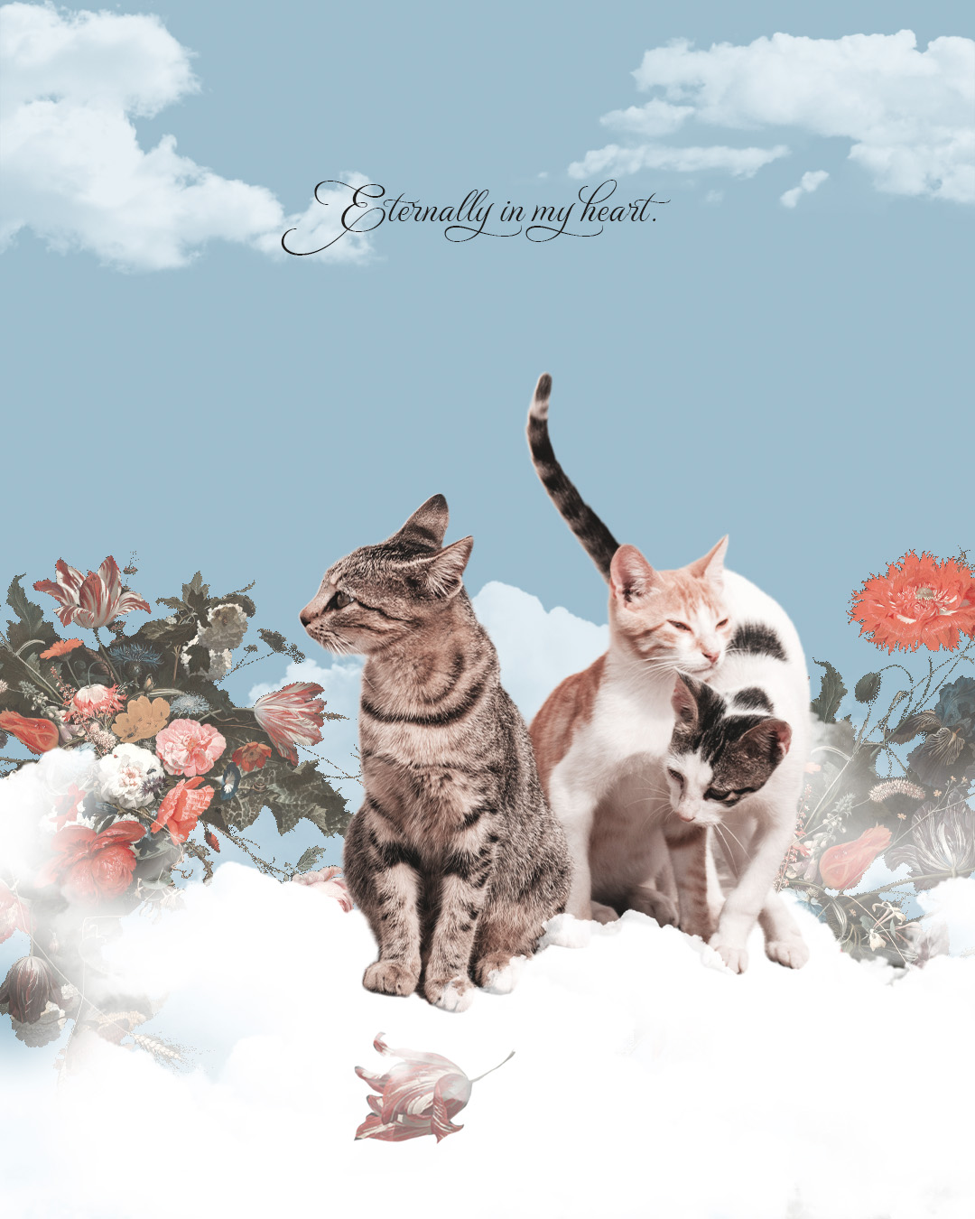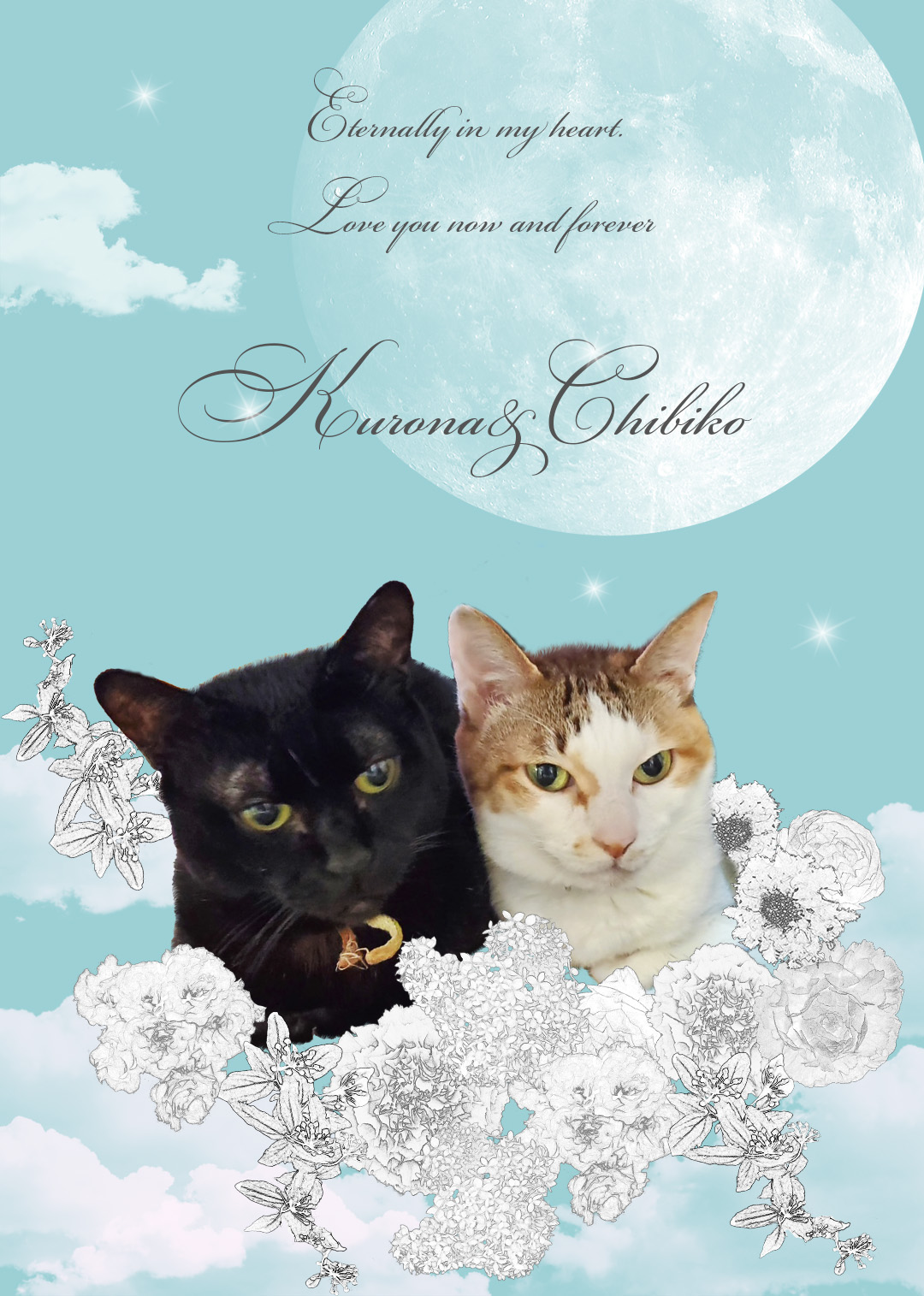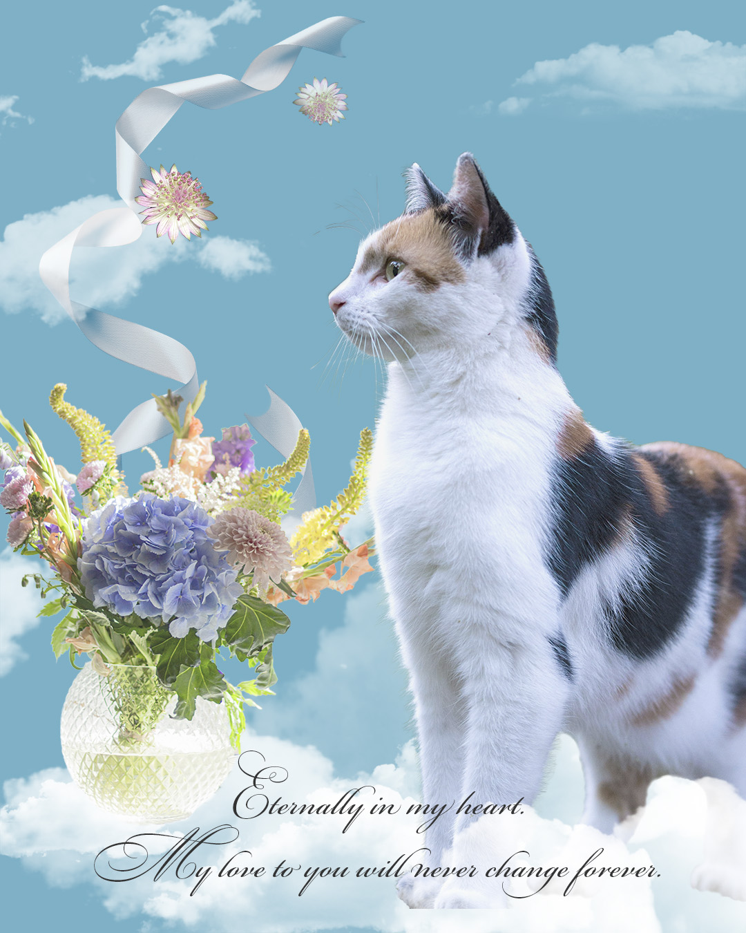 愛らしい猫達を、雲や花とアレンジして美しいアート作品にしています インテリアとして部屋に飾りながらその姿を偲べるように