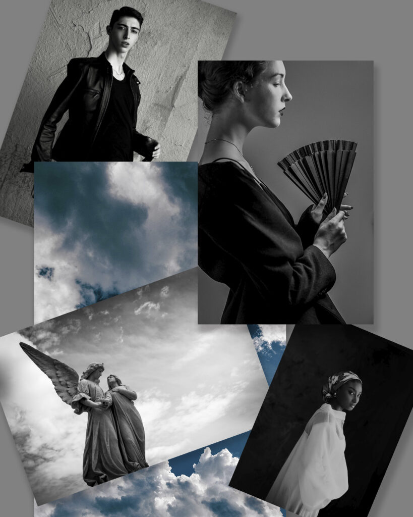 光を反射していうような雲のかかる宵の空に、人物と天使像が交差するように配置したコラージュです。