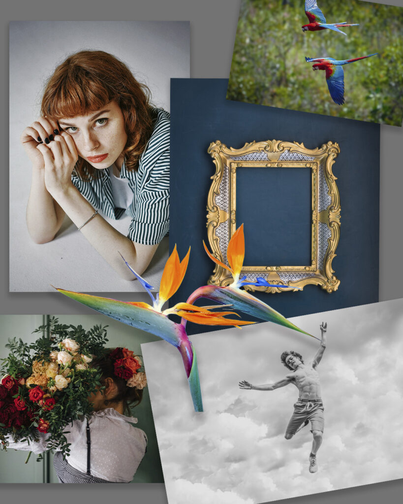 クラシックな額縁から飛び出す人物と鳥、そして目力のある女性のコラージュです。新しい物語が幕を開ける前のワンシーンのように作り込みました。