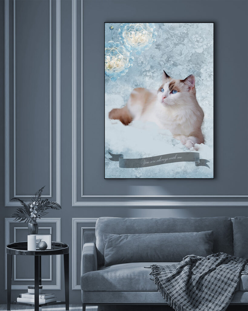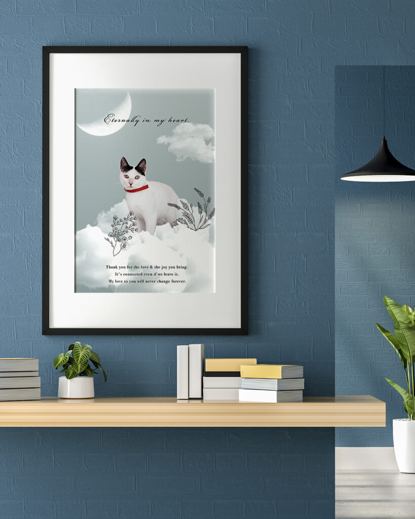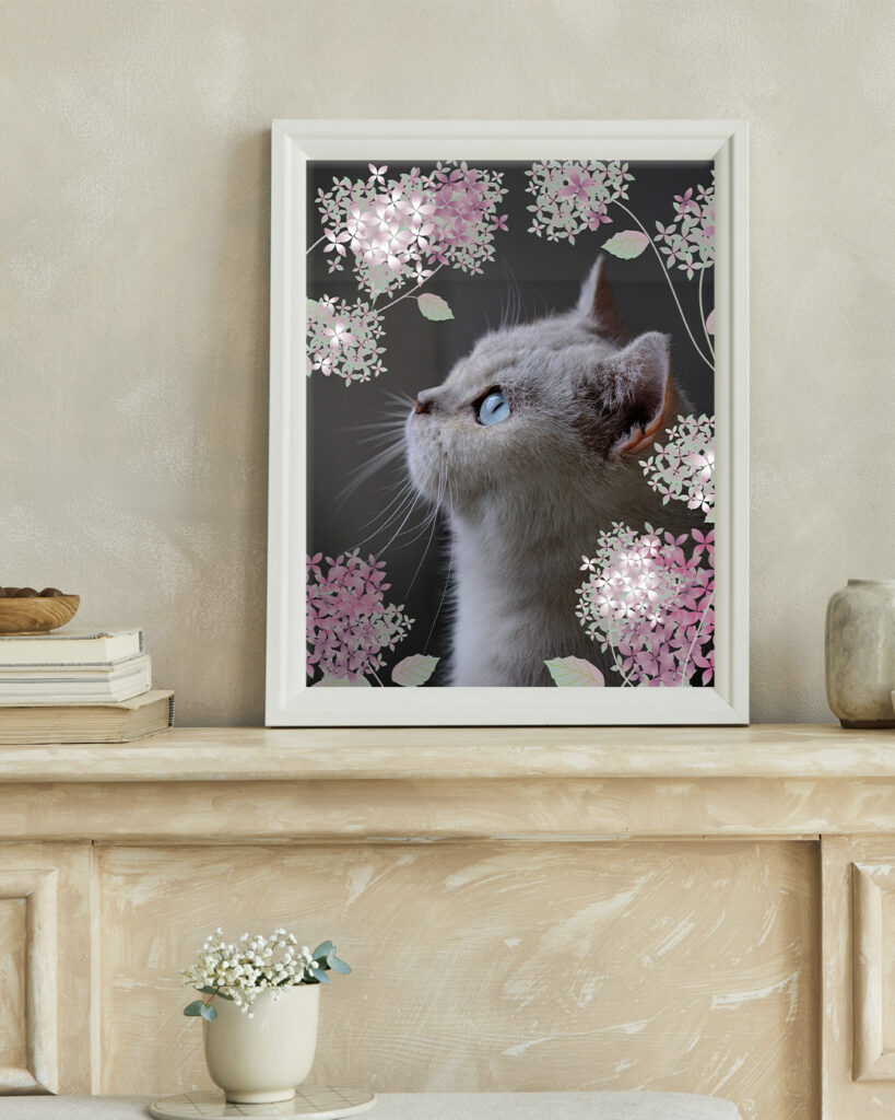 猫さんと雲を背景に浮かべ、花々を添えた作品は、眺めるだけで穏やかな気持ちになり、インテリアとしても品よくお部屋に調和します。訪れる人の目にも温かく映り、優しい記憶を分かち合うことができるのです。