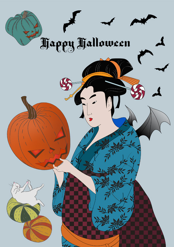 最後はハロウィンイラストで終わりにします。以前描いた浮世絵をハロウィンにアレンジしたものです。