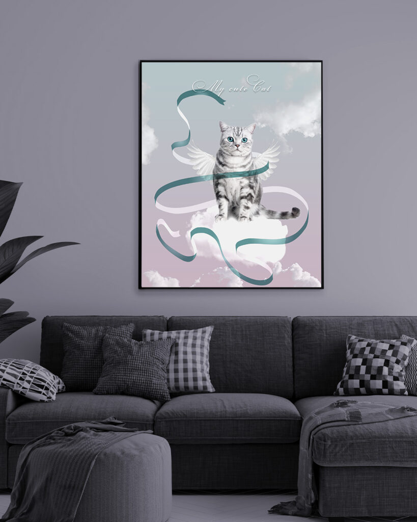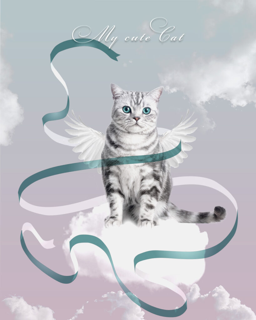 こちらは小さな翼をつけて雲の上にいる猫さんです。柔らかなグラデーションの空を背景にリボンがゆらめいています。