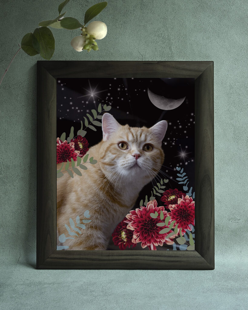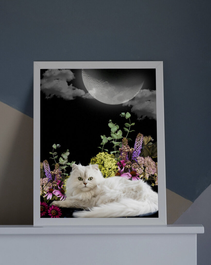 こちらの白猫さんは色鮮やかな花々に囲まれて寝そべっています。大きなお月様を背景に、魔法が使えそうな顔をしていますね。